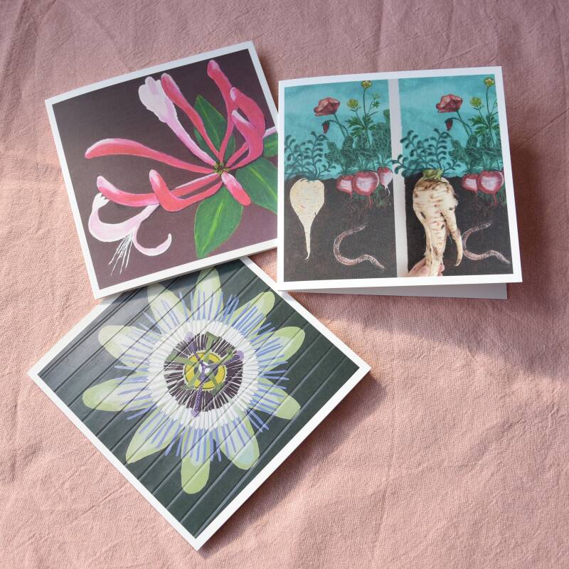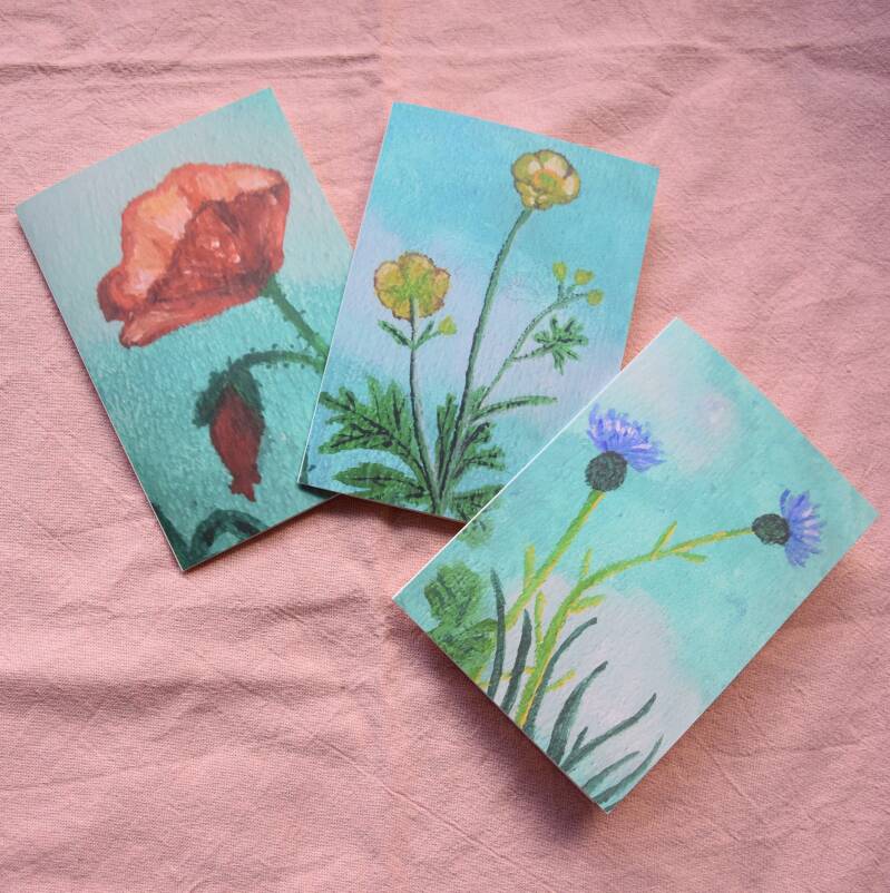 De afbeeldingen op de wenskaarten komen uit mijn schilderwerk. De serie "veldbloemen" bestaat bijvoorbeeld uit details van de mural "Moestuin", die ik in 2021 maakte.