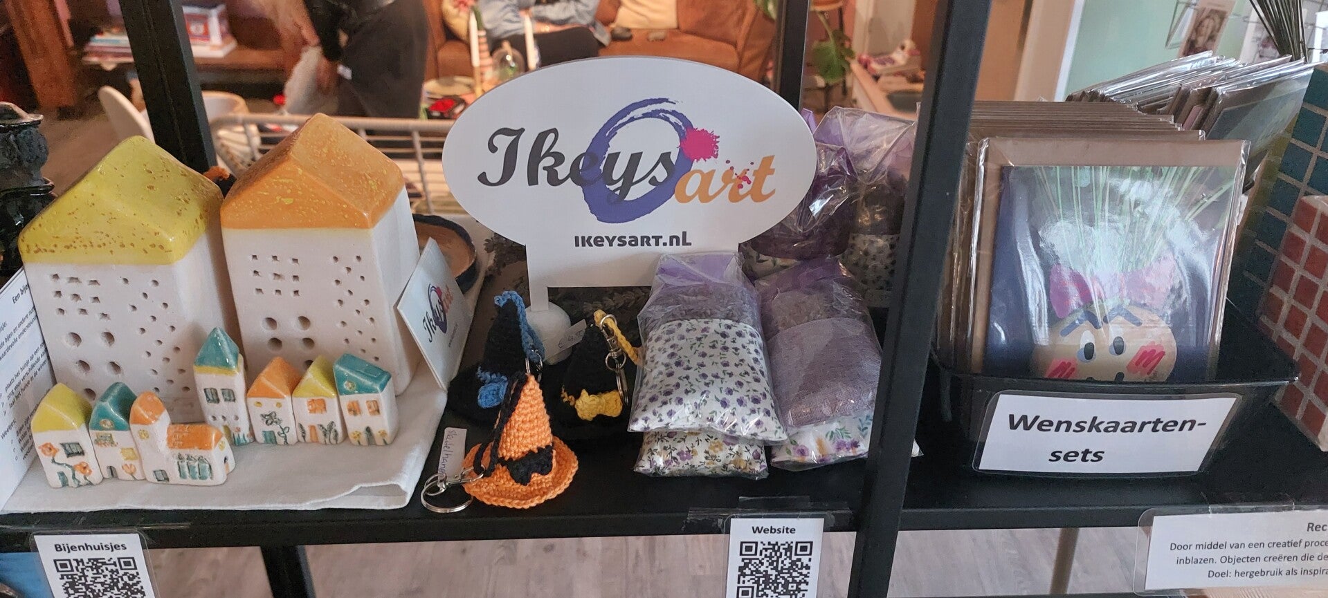In de kraam vind je: Kunst, Recycle-art, Art-prints, Bijenhuisjes van keramiek, Theemelanges, Jam, Pindarotsen, Boterkoek, Gevuld speculaas en Wenskaarten.