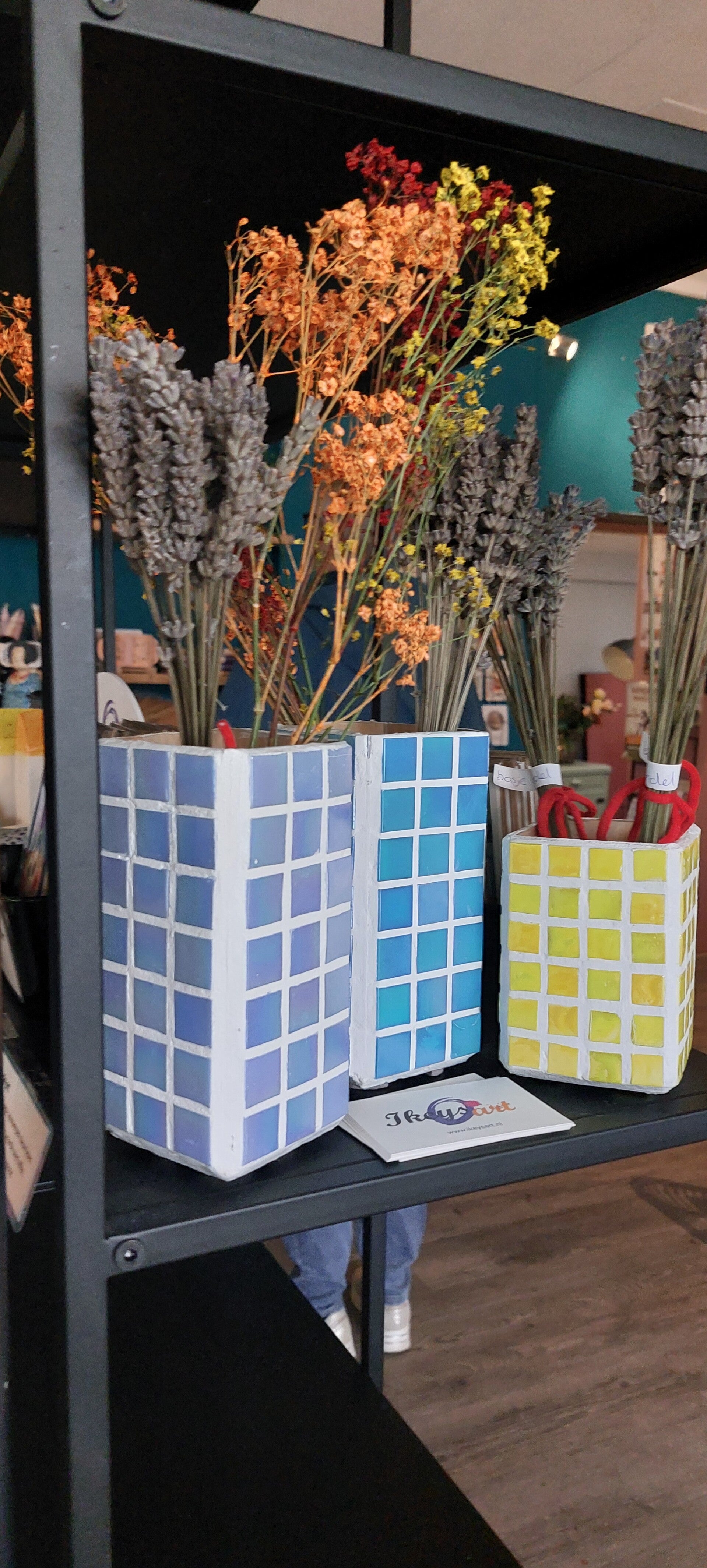 Vanaf 12 oktober is mijn plank in de conceptstore bij Zuss & Coffee, opnieuw ingericht. Naast de bijenhuisjes vind je er nu ook mozaiek-vazen van gerecyclede zuivelpakken, gedroogde lavendel en herfsttafereeltjes. Ook de molen met wenskaarten is vernieuwd. Kom een kijkje nemen bij dit gezellige koffie-adresje in Koudekerke.